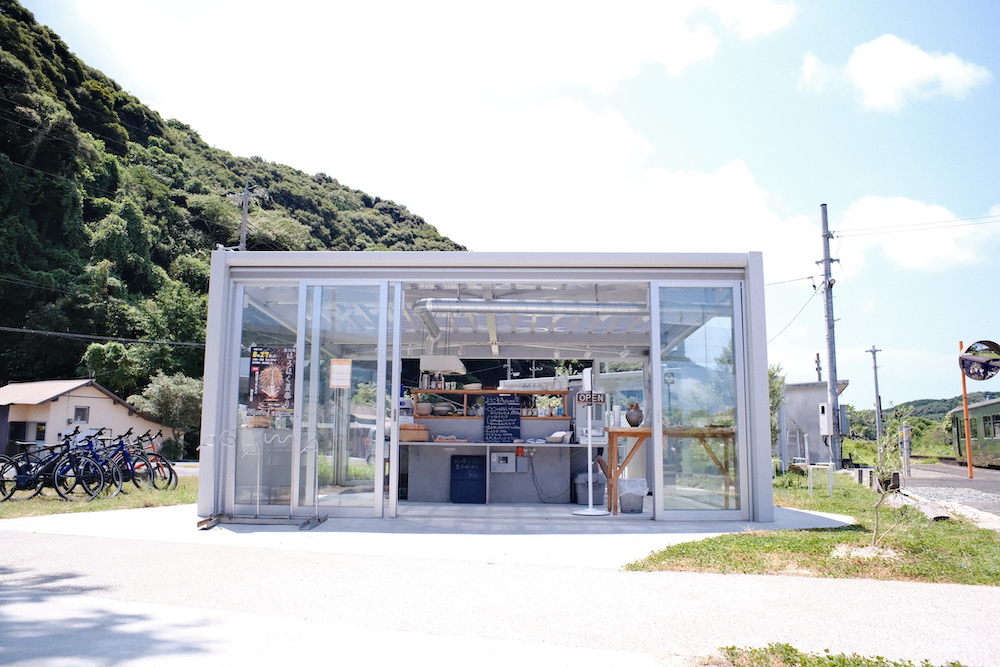 〈ruco〉のオープンから7年後、次に塩満さんが着手したのが、山口県下関市にあるJR西日本・山陰本線の阿川駅駅舎。日本の原風景のような場所にぽつんと建つ無人駅が、透明な四角の箱のキオスクとして生まれ変わりました。そこでは地産品を購入したり、コーヒーを飲んだり、イベントに参加することもできます。ゲストハウスの次に「駅」に注目した理由とは何だったのでしょうか。