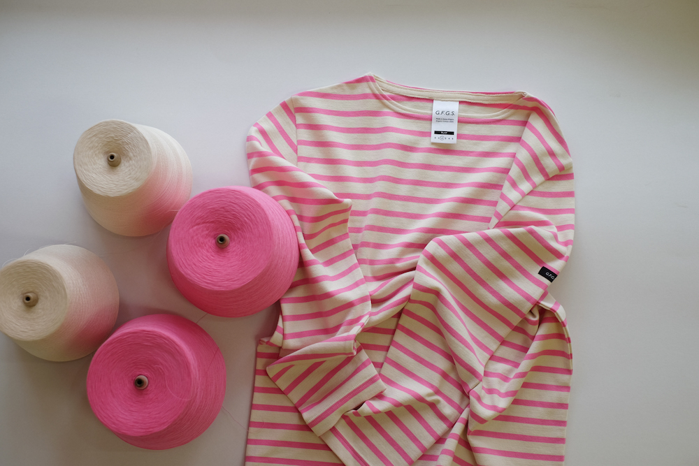 色の組み合わせやボーダーの太さを自由に選べるボーダーカットソー。新潟県加茂市にある〈G.F.G.S.〉ではそんな特別な一着を作ることができます。素材にはオーガニックコットンを使い、着心地も抜群。このファクトリーブランドは、この街出身の小栁雄一郎さんによって2013年に設立されました。