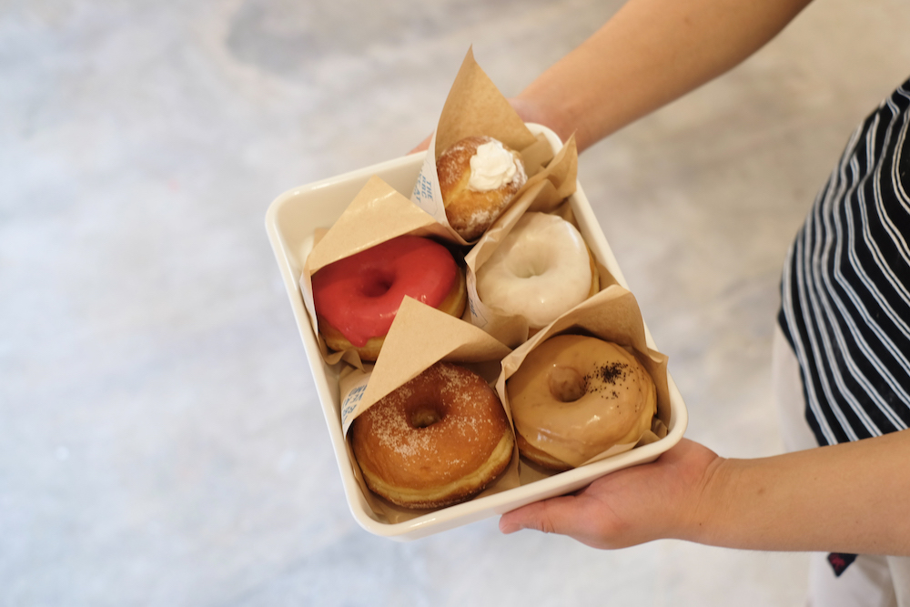〈BBC Kamo Miyagemono Center〉で、地域の特産品と一緒に並ぶ手作りのドーナツ。期間限定で、季節の果物や加茂市の名産品を使ったフレーバーも提供している。