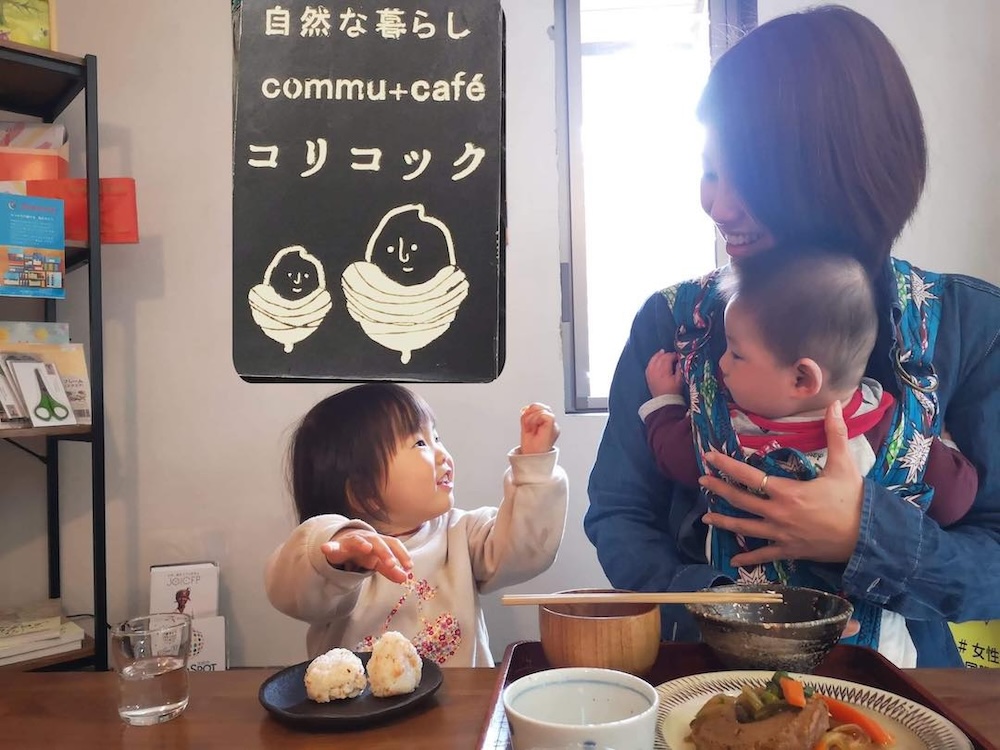 岡本さんは、〈自然な暮らしcommu+cafeコリコック〉というカフェも運営し、子育て世代がコミュニティを築ける環境をつくっています。