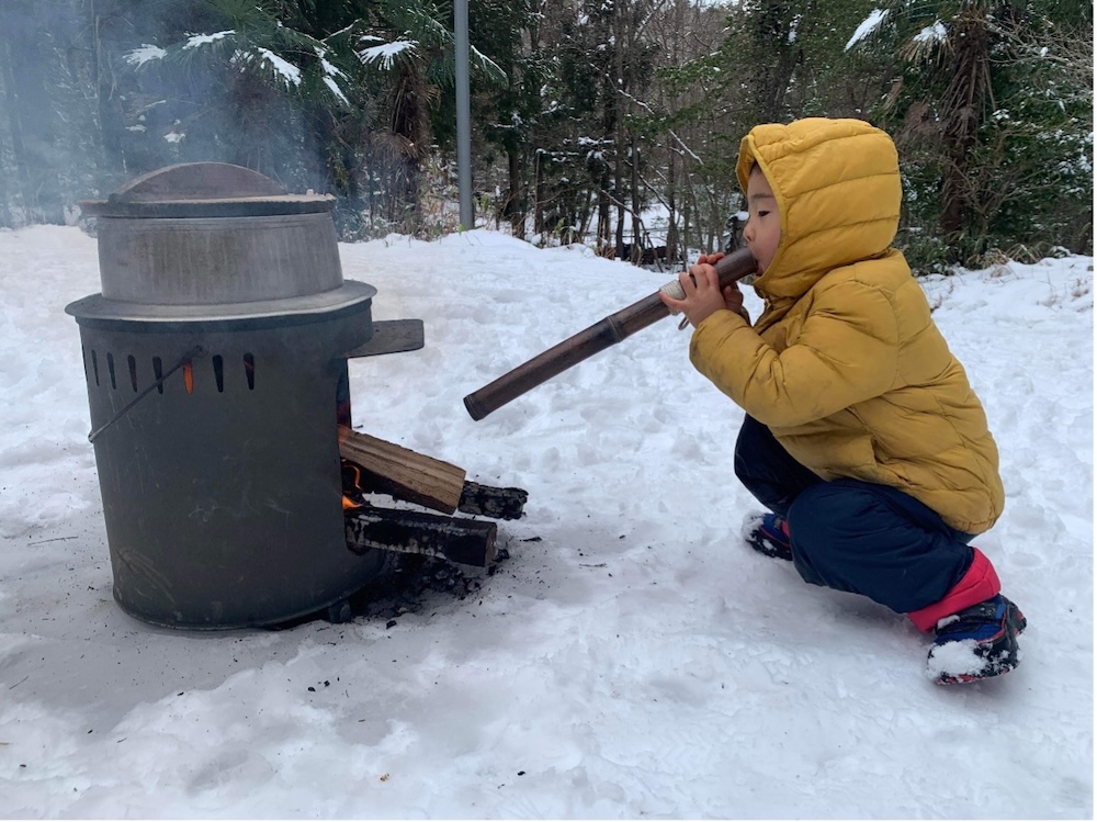 「雪の降る日も基本的に外で活動します。ここは山のなかなので、冬場はとても寒い。寒い日は朝登園してきた子から、焚き火のために火を起こします。そのやり方も、大人が教えるのではなく年長さんが小さい子たちに教えてあげています。でもやりたくない子に無理やりやらせることはしません。子供のやりたい気持ちを見守っていたら、子供たちはいつもキラキラ目を輝かせていられるんだと実感しています」