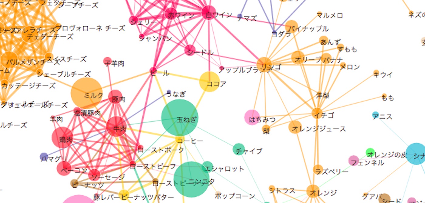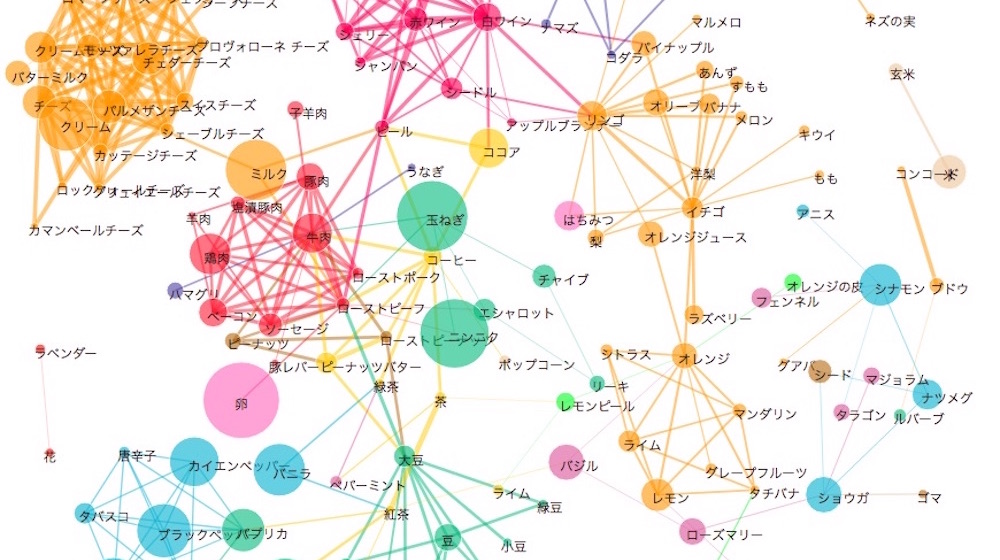 前回お話を聞かせてくれた食の人工知能の開発者のひとりである風間正弘さんによれば、「Flavor Network」では、食材同士の「相性の良さ」が表されています。食材の中にある風味化合物(=いわば香り成分)のデータを調べ、「食材同士に共通する化合物」がどれくらいあるかを計算し、共通点が多いほど「相性がいい」と判断しているのだそうです。
