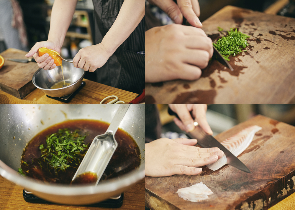 「僕の中では、どちらも華やかなイメージがある食材です。香りもそうだし、ちょっと夏っぽいイメージもあるかな。だから、合わないというイメージはないですね。今回は、この2つの食材を使って自家製ポン酢を作ってみました。ただ、お刺身にかけておいしいかどうかは、実際にやってみないとわかりませんでした」