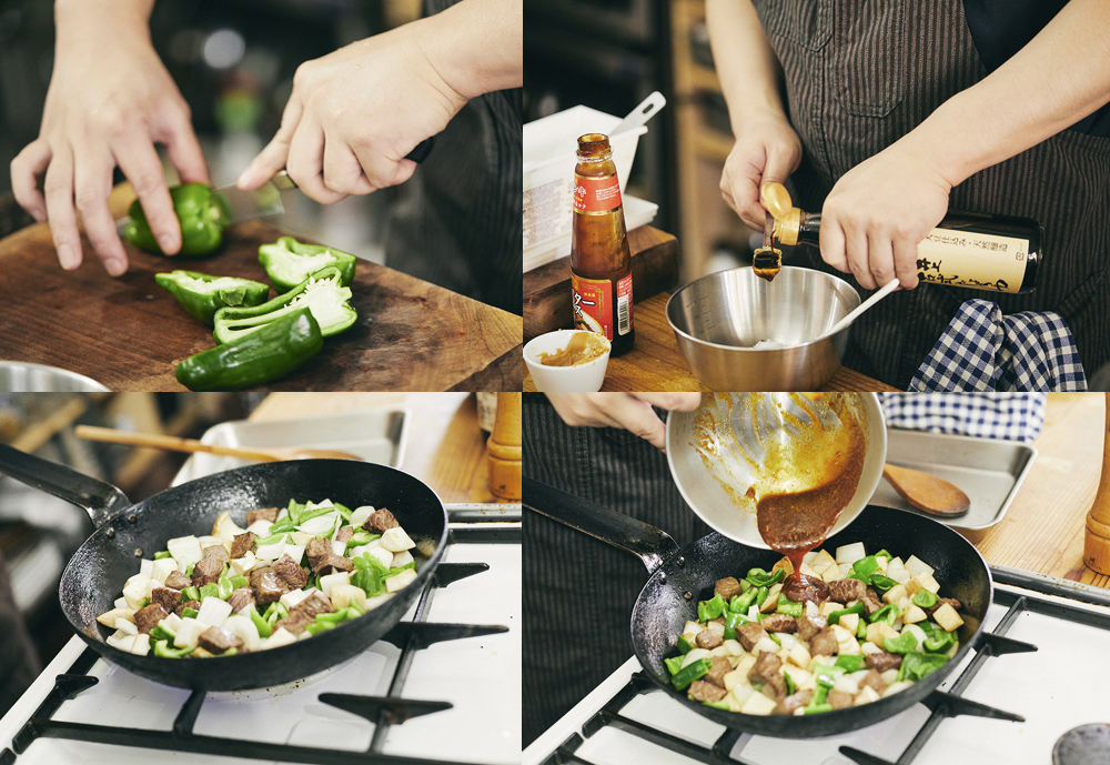 1、牛肉、ピーマン、玉ねぎ、エリンギを角切りする。