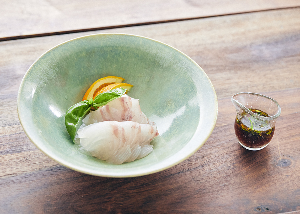 1皿目:オレンジバジルぽん酢 白身魚のお刺身