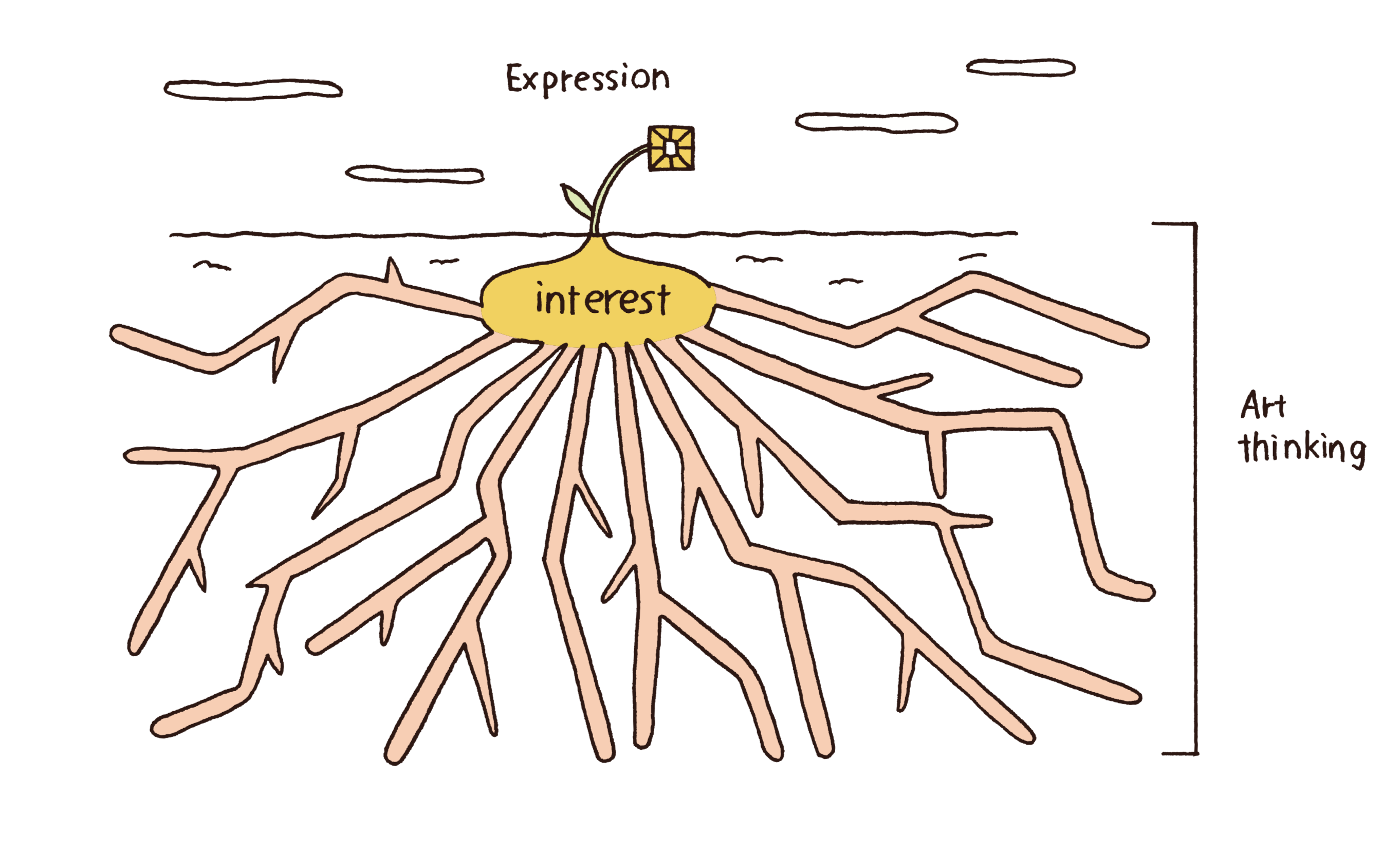 私の書いた『13 歳からのアート思考』という本の中では「アート作品を花だとすると、作品が生み出されるまでの過程での考え方は地面の中に伸びる根っこ」と仮定しています。実際に手を動かして作品を作っていくことはもちろんですが、アートを通して自分の興味や疑問に向き合ったり、常識を疑ってみたりすることもまた面白いところ。そして、その根を伸ばして行くための考え方をアート思考だと考えています。本で挙げているようなピカソやデュシャンなどの20世紀のアーティストたちは、常識やルール、当たり前などと言われている、小さくて誰も目を付けずに見過ごされてきたところに目をつけて、それを覆していきました。アーティストのように思考する、それがアート思考です。