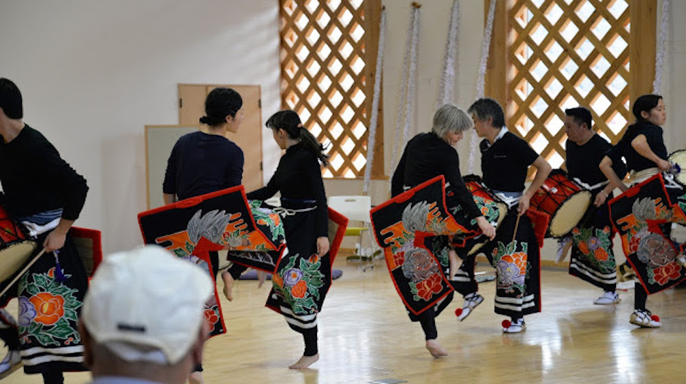 「陸前高田アーティスト・イン・レジデンスプログラム」で行われた、岩手県住田町柿内沢鹿踊保存会とウェールズのダンサーSioned Huwsとのコラボレーションによる新しいダンスの創作。photo:松山隼