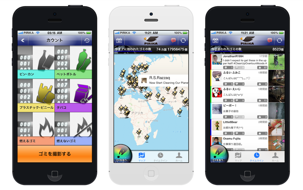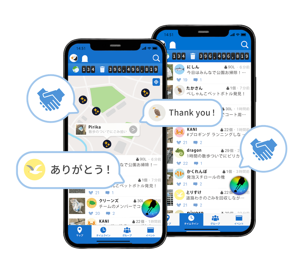 ごみ拾いSNS「ピリカ」ではごみを拾った情報がタイムライン上で共有され、ユーザー間で「ありがとう」を送り合える