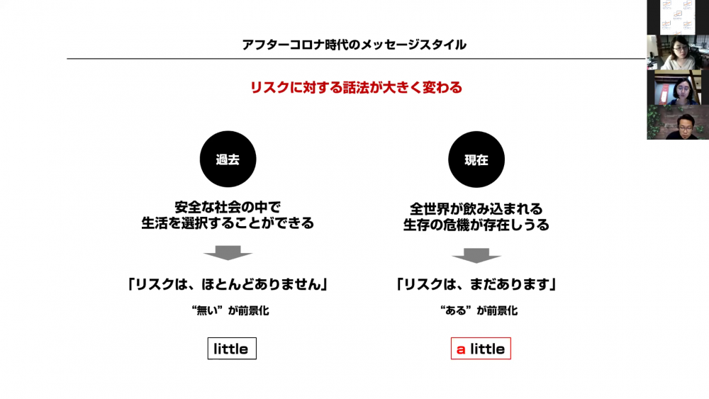 アフターコロナ時代では、“リスク”に対する話法が変わるとともに、聞き手側の認識も変わっていく。(堀内さんの資料より)