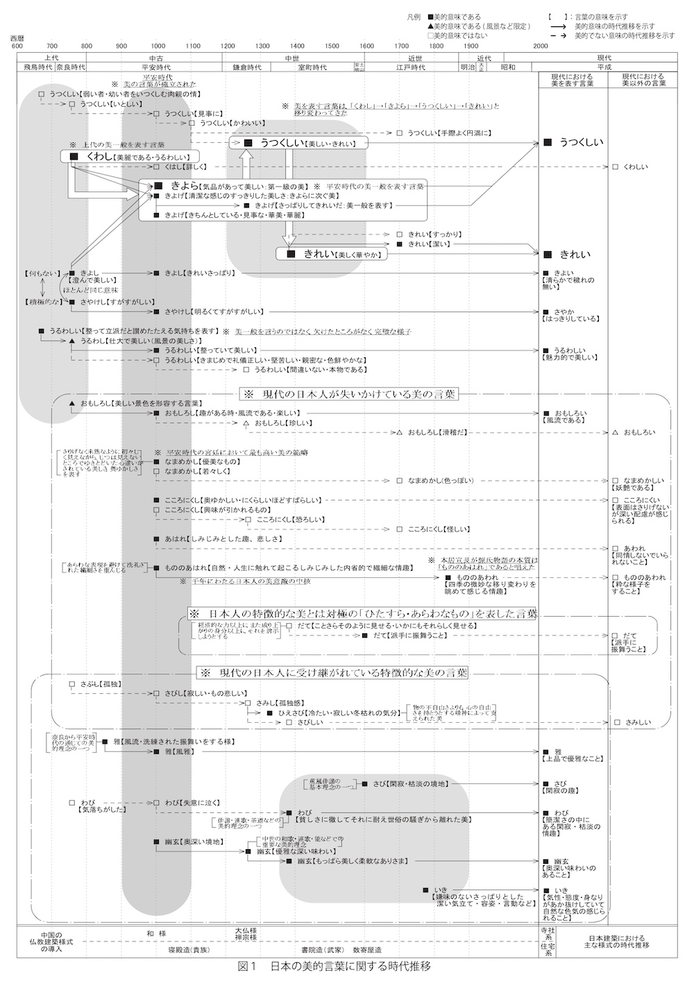 芸術工学会誌77号「日本の美的概念に関する時代推移とその構成モデル」より。(https://www.jstage.jst.go.jp/article/designresearch/77/0/77_158/_article/-char/ja/)