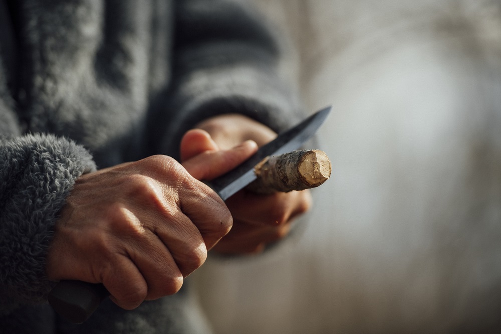 ナイフを使って枝を削り、シェルターを立てる際に必要な杭を作る川口さん