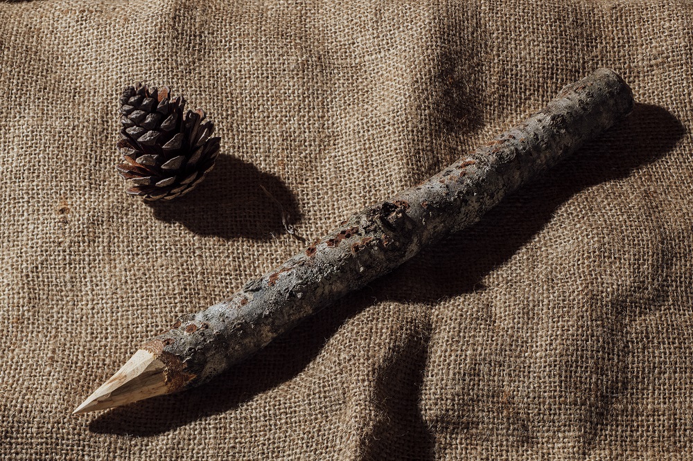 川口さんがナイフを使って作った杭と、着火剤として使用されるまつぼっくり