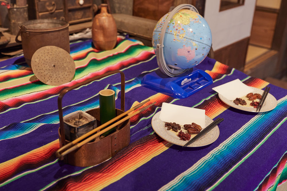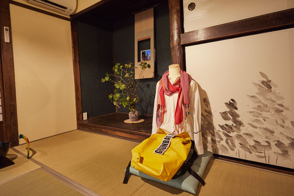 今回お茶会にお迎えするペルソナ像は、PC1台を持って世界中を移動しながら働く女性、ノマドさん。彼女は、好きなことを本気で追求する性格です。今はサステナビリティに興味があり、スローフードについても学びを深めるべく会社を辞めてイタリアの大学院へ留学することを決めました。休日は親しい友人とホームパーティーを楽しむことが大好き。和室には、そんなノマドさんのマネキンが置かれています。古着を着て、エジプトで購入したストールを巻き、メッセンジャーバックを持ったノマドさんのトルソーが、存在感を放ちます。