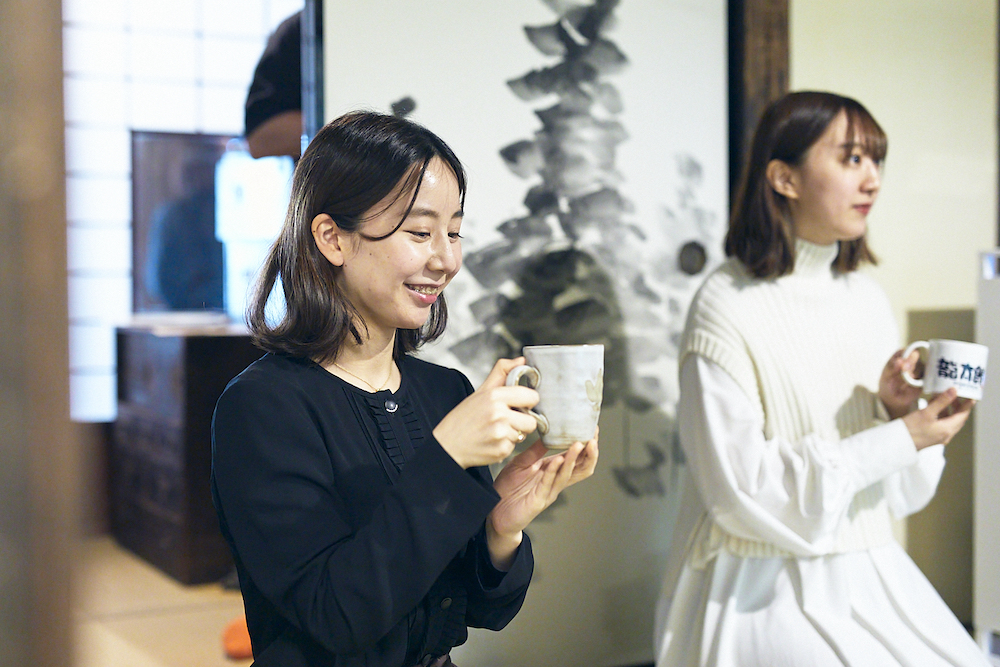 お茶は、有機ほうじ茶豆乳ラテ。こちらもペルソナさんが経営するカフェで人気メニューの1つです。使用したマグカップは、ペルソナさんが属する町内会の記念品である「町内会メンバーの名前入りマグカップ」。作法が厳しいイメージのあるお茶会ですが、松村さんによるユニークな演出に参加者も緊張感がほぐれ、楽しんでいる様子でした。