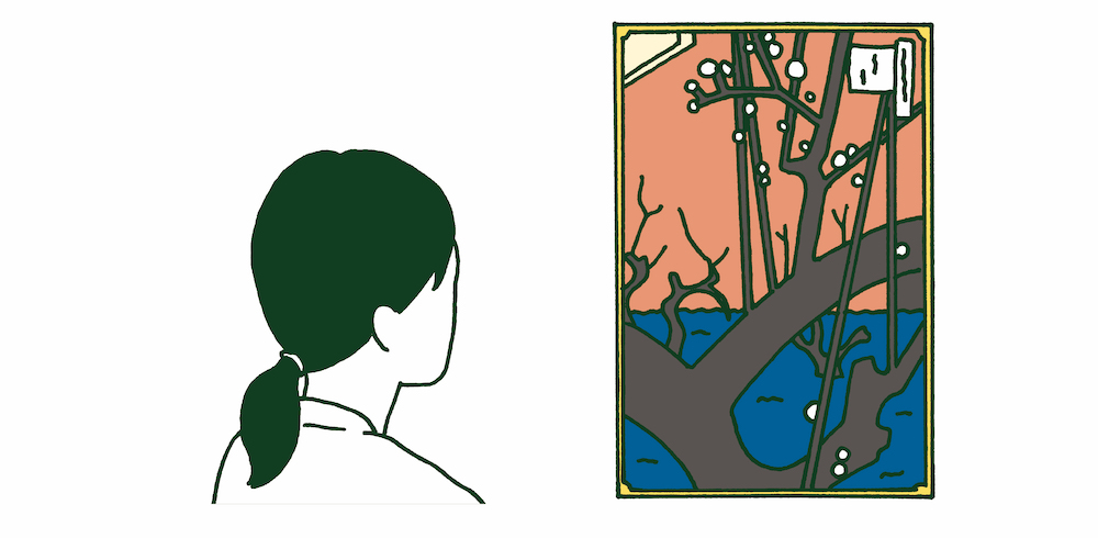 第8代将軍徳川吉宗も訪れた、かつて亀戸天神社の裏手にあった梅園「亀戸梅屋舗」を描いた浮世絵。手前に大きな梅の枝を描いた技法が斬新で、ゴッホが模写したことでも有名。