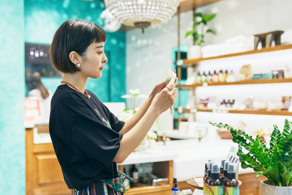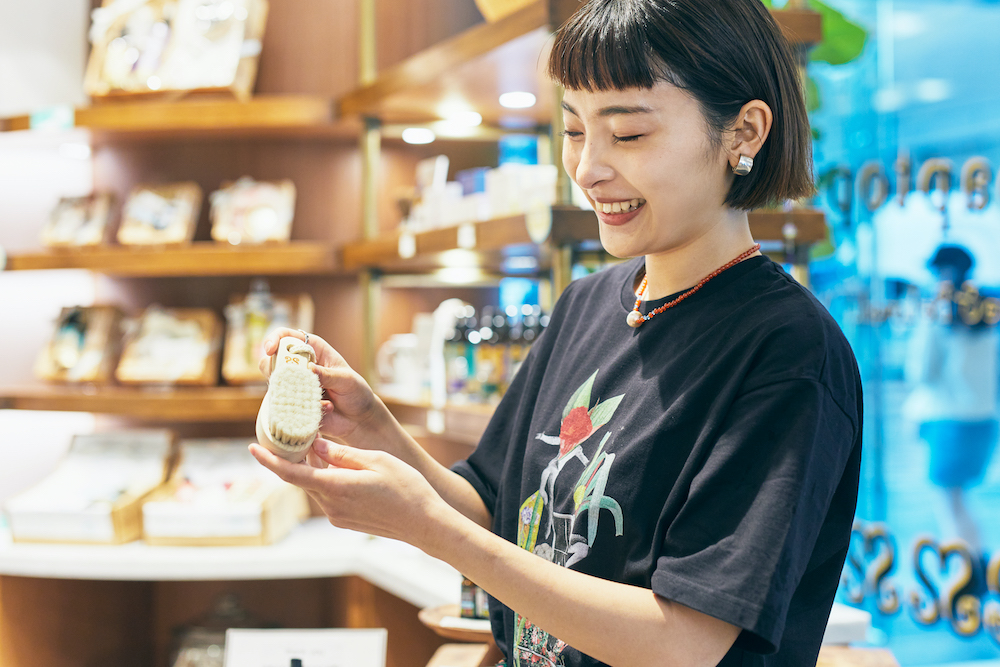 商品が決まったところで萌菜さんが向かった先は、ナチュラルボディケアブランド〈Soaptopia〉の店舗です。