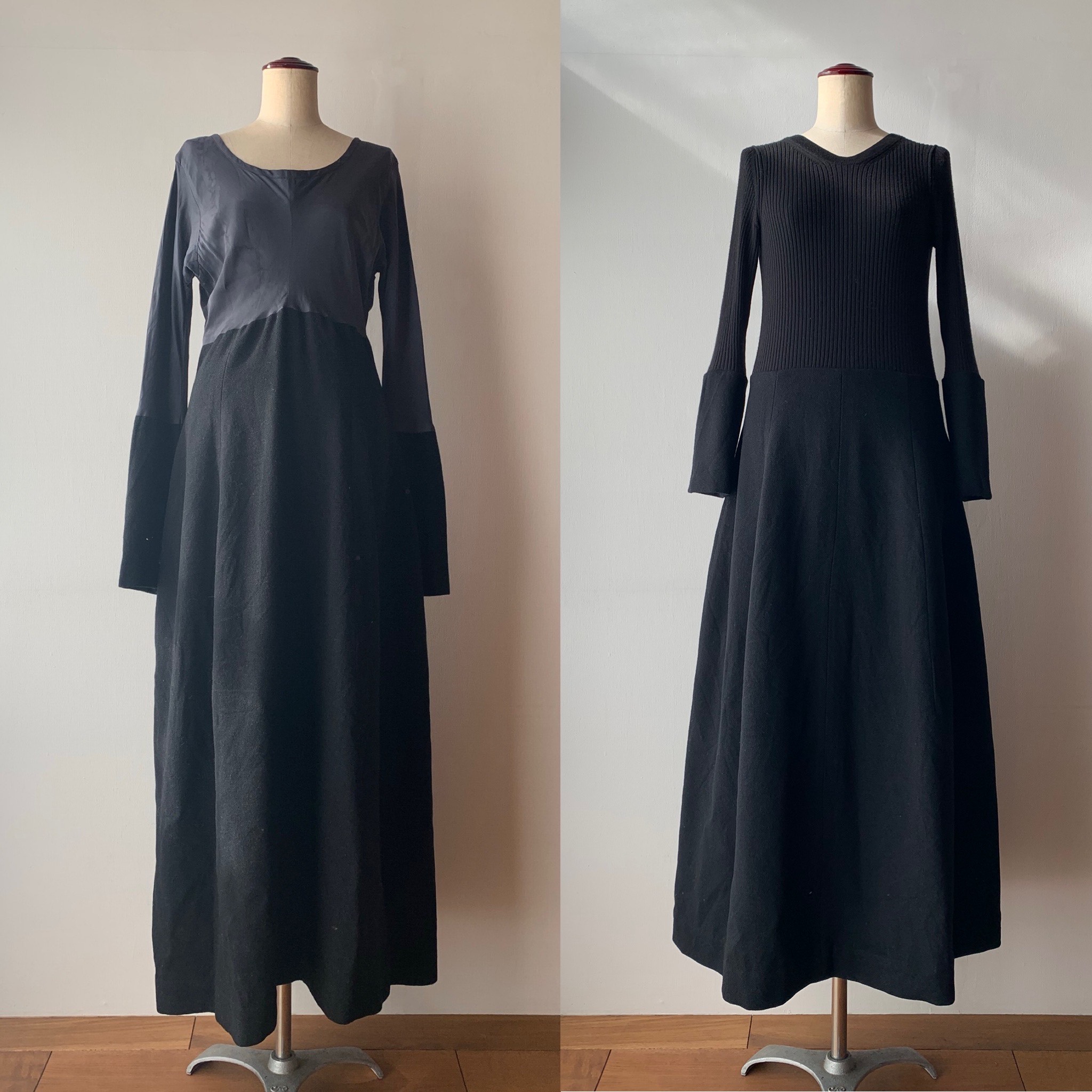 左がbefore、右がafter。20代前半に奮発して買ったものの箪笥の奥に眠っていたワンピース。丈も長めで、襟周りも大きく開いていたところも気になり、着る機会がなかったため、思い切ってリメイク。上半身はニット生地を使って、より気軽に着やすくなりました。
