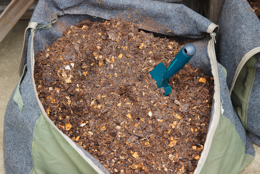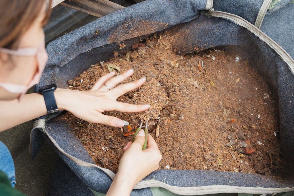 そうですね、本当に1日1-2分でできるものになっています。全部で生ごみが20kgほど入るようになっているので、2ヶ月から3ヶ月ほど生ごみを入れ続けていただいて、その後3週間ほど熟成期間に入ります。熟成中に水分量が足りなかったら水を入れてしっかり混ぜていただくと、最終的にしっかり生ごみの形がなくなった、栄養たっぷりの堆肥ができあがります。野菜くずだけじゃなく、卵の殻とか鳥の骨、魚の骨も入れられます。