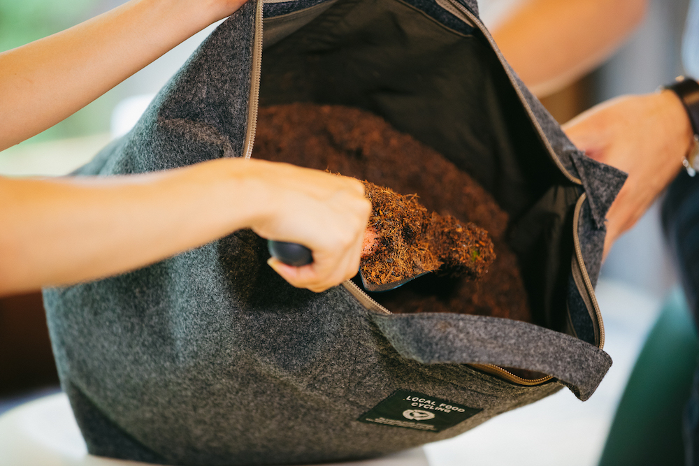 本イベントに入る前に、今回も会場にて、バッグ型コンポスト「LFCコンポスト」を開発しているローカルフードサイクリング株式会社(LFC)による堆肥の回収会&マルシェを開催。LFCのSNSやメルマガをご覧になった方々が、ご自宅のLFCコンポストで育てた堆肥を持ち寄ってくださいました。埼玉からいらっしゃった方もおり、各地から集まった堆肥が混ぜられ、農家へと送られます。