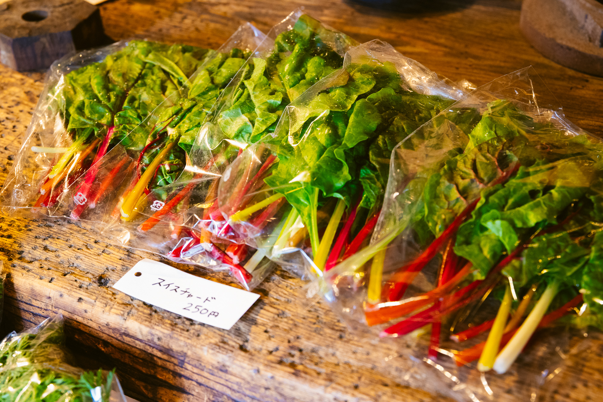 マルシェには、冬の訪れを感じさせるような野菜がラインナップ。珍しい白ナスやタァサイ、スイスチャードなども並び、思わず目移りしてしまいます。親しみのない野菜でも、スタッフの方がおいしい食べ方を教えてくれるから安心です。