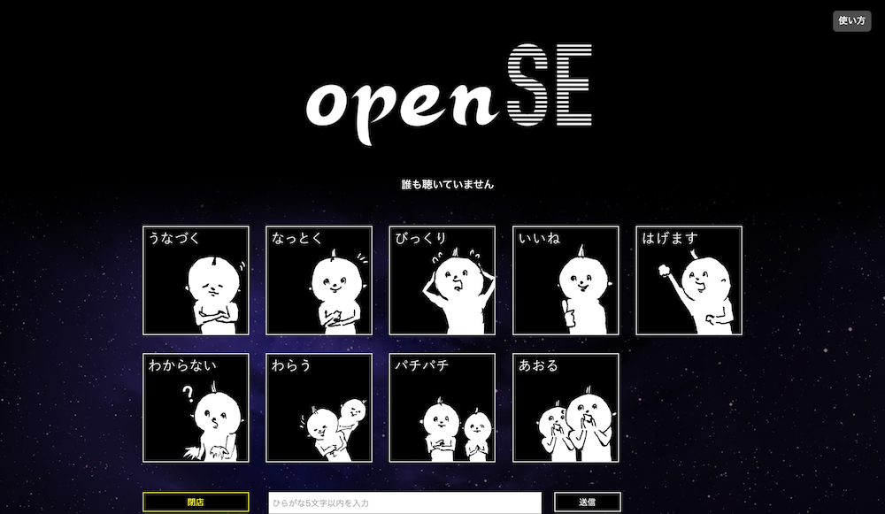 「openSE」は、配信者に対して、聞き手が自由にレスポンスを発信できる装置。スタンプや打ち込んだ文字が、ユーモアのある音声として流れることで、配信者の実空間に介入することができるツールです。制作のきっかけはClubhouseのコミュニケーションでのとある疑問からでした。スピーカーとリスナーが極端に分かれる0か100かのコミュニケーションではなく、30~40くらいの「ぬるま湯」的なコミュニケーションのある世界観を目指しています。対面の場にある相槌や表情、間合いのような曖昧なコミュニケーションを、デジタル空間に導入したものです。