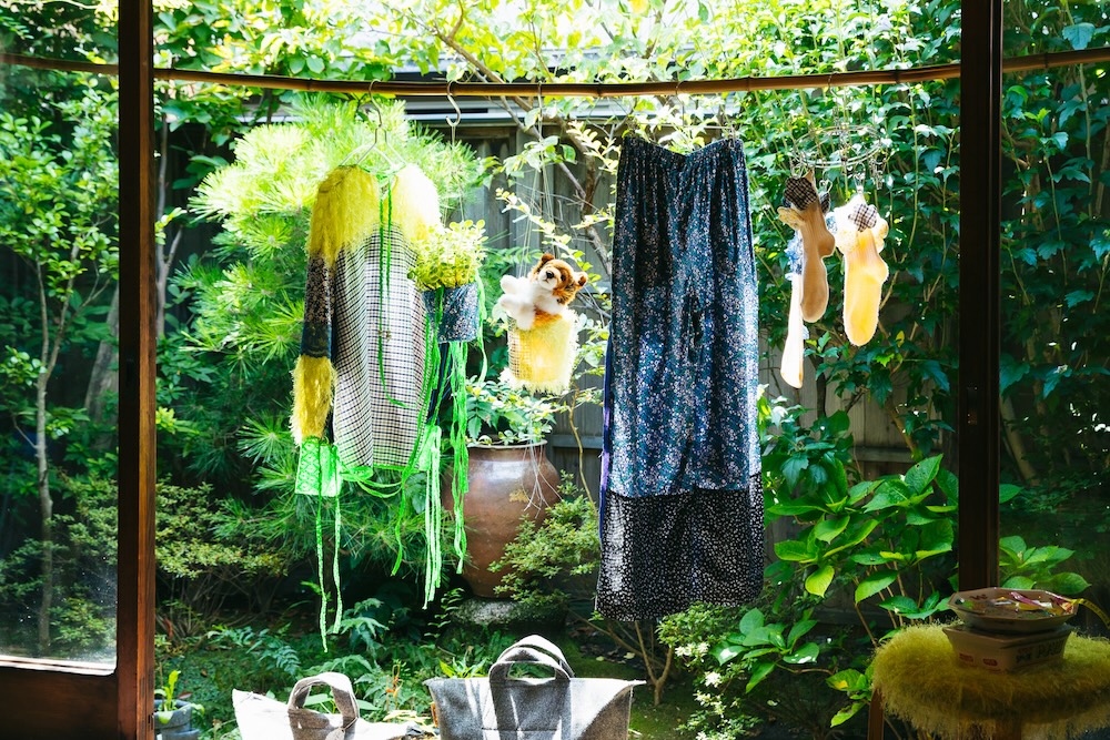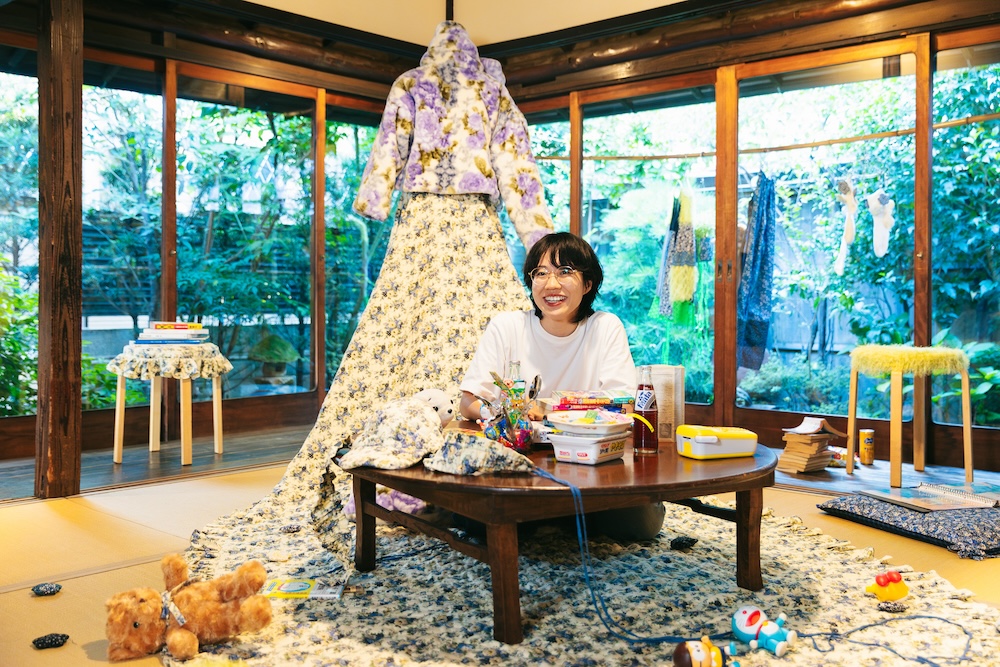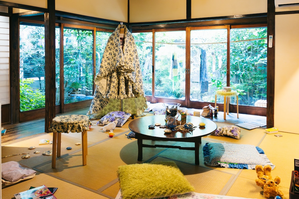 「作品の雰囲気とかけ離れたこの散らかりっぷりは、普段インドア派な私の部屋を再現しています(笑)。服を作る時もミシンは出しっぱなしですし、布もたくさんストックしていて、本当に散らかり放題なんです。今回の個展では、そんな私の日常の部屋から非日常へとつながる空間を作ろうと考えました。訪れた人が思わず『ただいま〜』と言ってしまうようなアットホーム感を演出しつつ、ところどころに『?』となるような要素も散りばめたんですよ」(鍵和田さん)