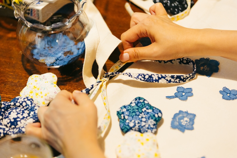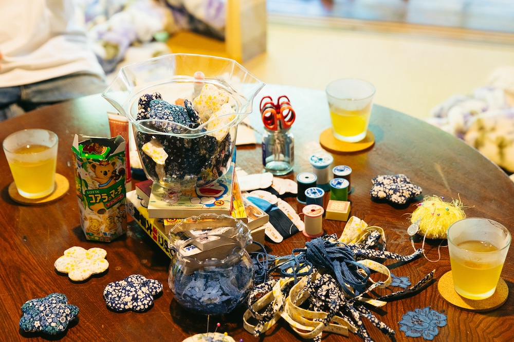 「大切な思い出の品や、仕舞い込んでいたアイテムを、また使いたくなるものにリメイクする。簡単にできるサステナブルなアクションだと思います。この空間を制作している時に出た余り布の端切れで、モチーフやリボンなどのパーツを作りました。これらを使って自由にアイテムをリメイクしてみましょう! 展示している作品から直接パーツを切り取ってもいいですよ」(鍵和田さん)
