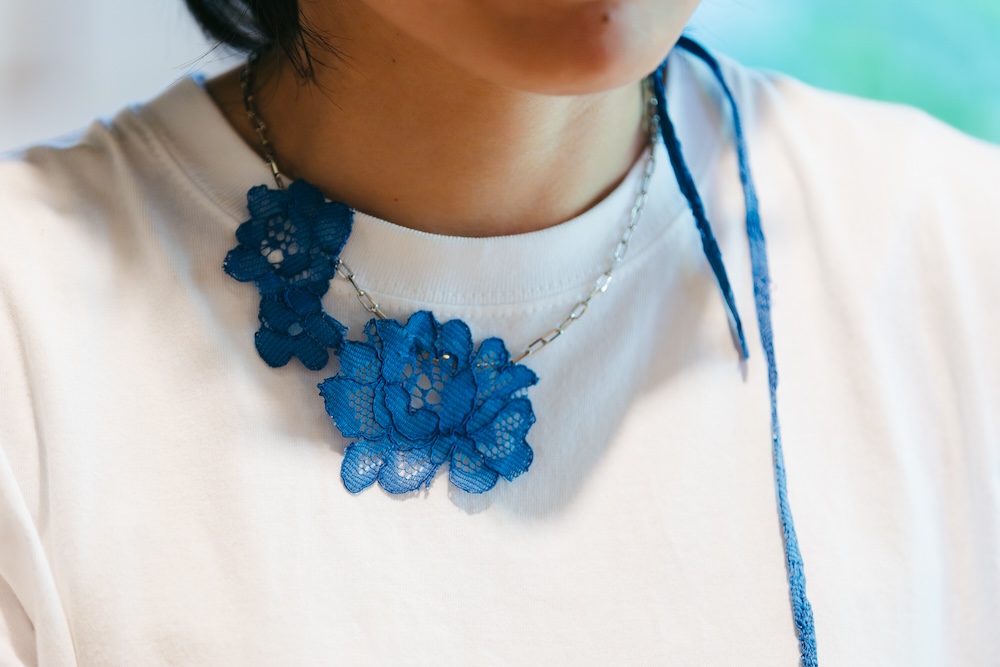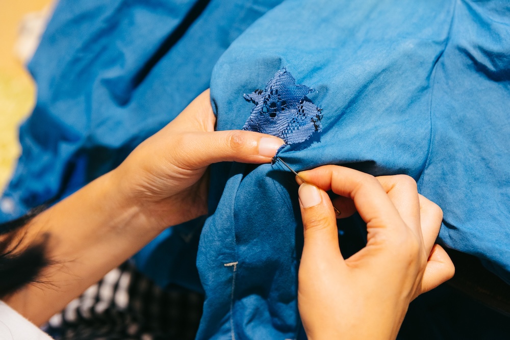 みほさんは、汚れている部分がうまく染まらず、捨てるか悩んでいたという藍染めのワンピースを持参してリメイク。汚れが気になる部分にレースのモチーフを添えます。「隠すというよりも、むしろアクセントになりました。捨てる以外の選択肢としてリメイクがあったことを、今まで忘れていた気がします。処分しようと思っていたのですが、また着られるようになって本当にうれしいです」(みほさん)