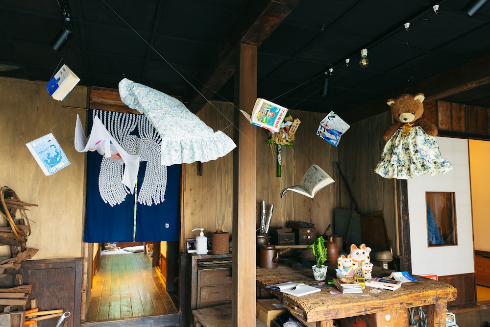「映画『ドラえもん のび太の宇宙漂流記』で、のび太の部屋が無重力空間になるシーンをイメージしました。藤子・F・不二雄さんが描くドラえもんの世界が昔から大好きなんです。映画作品は社会問題や環境問題を取り上げていることが多く、大人になった今でも強く影響を受けています。この個展が決まった時から、ドラえもんの世界観のような非日常的な空間を表現したいと思っていました」(鍵和田さん)