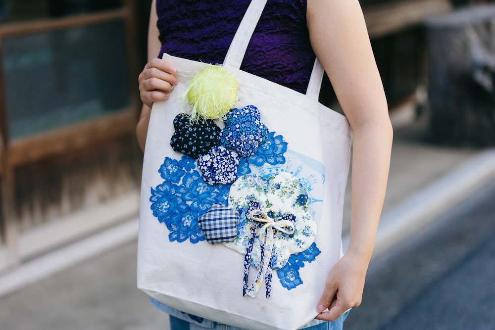 「ちゃぶ台にあった黄色の針山が可愛かったので、アクセントで付けちゃいました!」と、しのさんのセンスは抜群。バッグの元のプリントと、鍵和田さんの立体的なパーツとの組み合わせがユニークなリメイクが完成!お見事です。