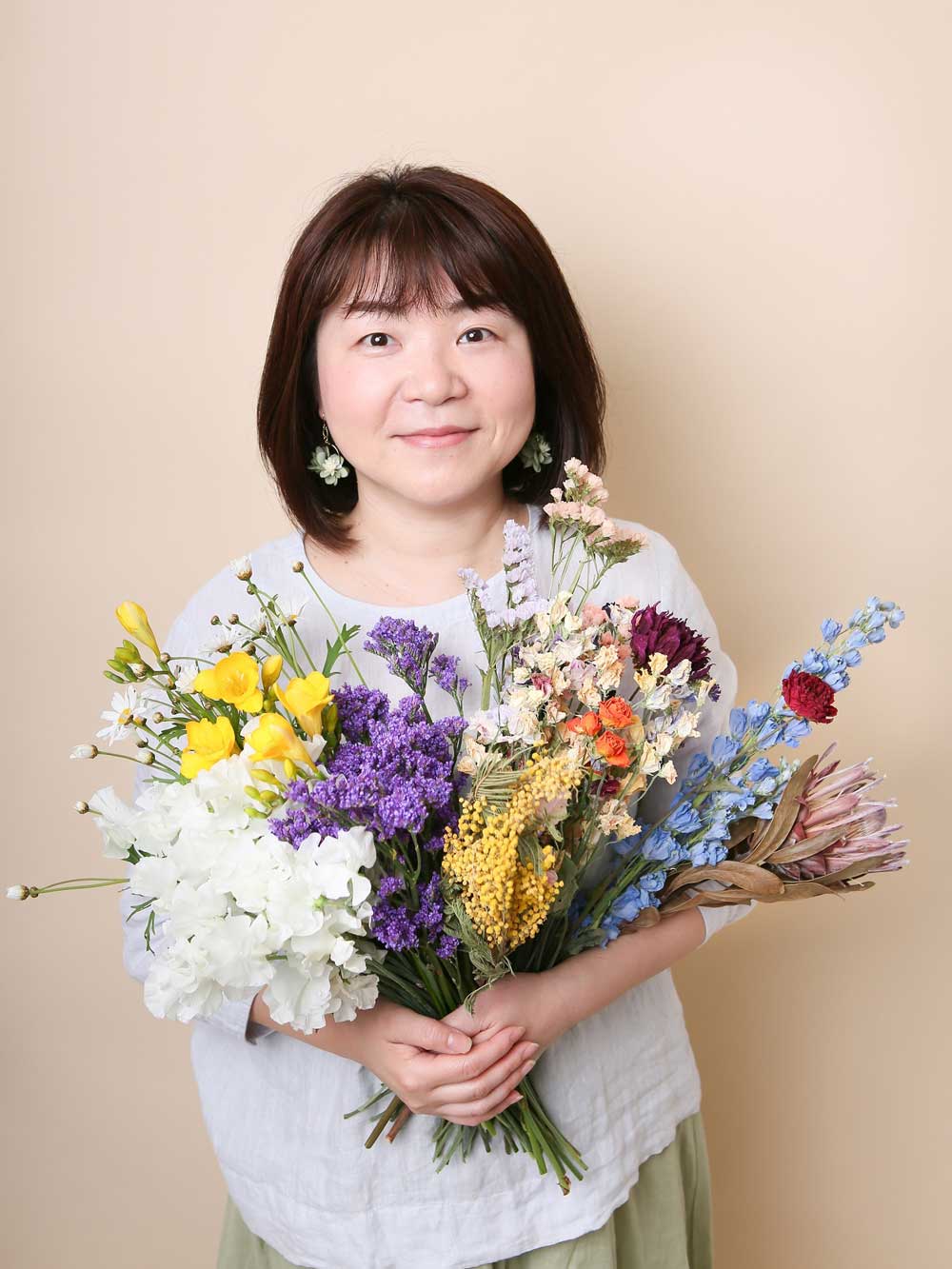 「花が一輪あるだけでも、ぱっと部屋の中が明るくなります。花は一本250円、300円するので高いと思われる方もいるかもしれません。しかしちょっと節約して花を買ってみると、その良さを実感してもらえると思います。季節ごとに咲く花があるので、部屋の中でも四季を感じることができます。切り花を飾った後はドライフラワーにすれば、また違う形で花を楽しむことができます。実はドライフラワーを作るのは簡単なんです。私も今後はワークショップを開催して、ドライフラワーを家庭で作ってもらえるよう教えていきたいです」。