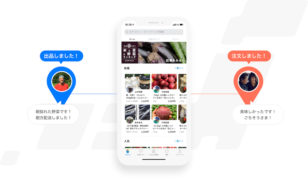 全国の農家や漁師とオンライン上で直接やりとりしながら、食材を買えるオンラインマルシェ『ポケットマルシェ』。コロナ禍の影響も相まって、2022年時点で約48万人の消費者が利用している。