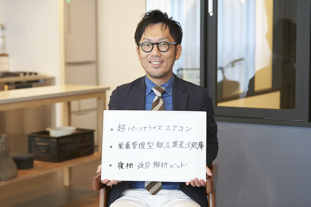 それを踏まえて、まずひとつ考えられるのは「空調システム」です。家族と暮らしていると、それぞれに体感温度が違いますよね。でも、1つの空間は、1パターンの空調のみです。ここは、改善の余地があるはず。たとえば、個人のバイタルデータなどを管理して、誰がどこにいるかをセンシングで把握して、自動的に温度を調整できるとさらに快適性が向上します。