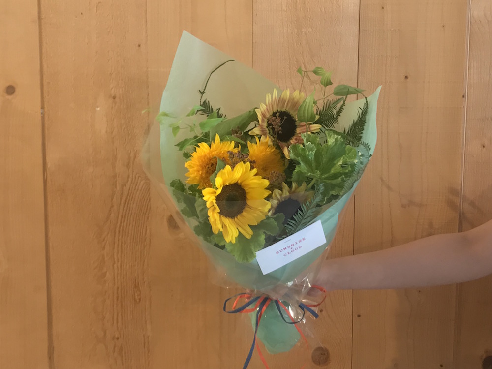 石村さん自身、庭に生えている野草を使ったアレンジがとても上手で、しっとりした雰囲気を作り出す名人なんです。だから僕からのプレゼントは、それとは雰囲気の違う、ドーンと「花」をメインにしたものを贈りたいです。元気になる花といったら、季節柄向日葵がいいですね。黄色と緑をメインに、夏を感じさせるものにしてみました。