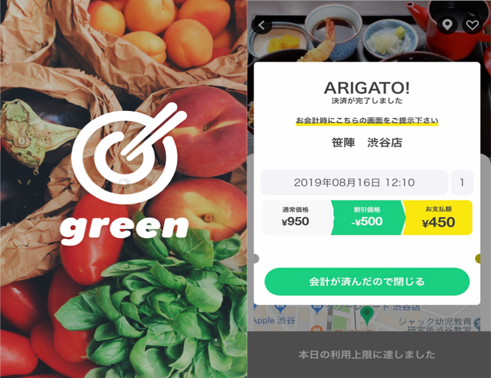 「green」のアプリ画面。greenを導入した企業の社員は加盟店舗で、安くランチを食べることができる。
