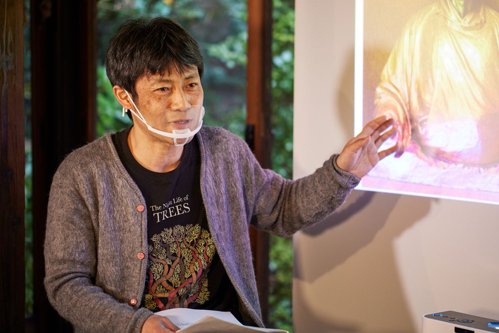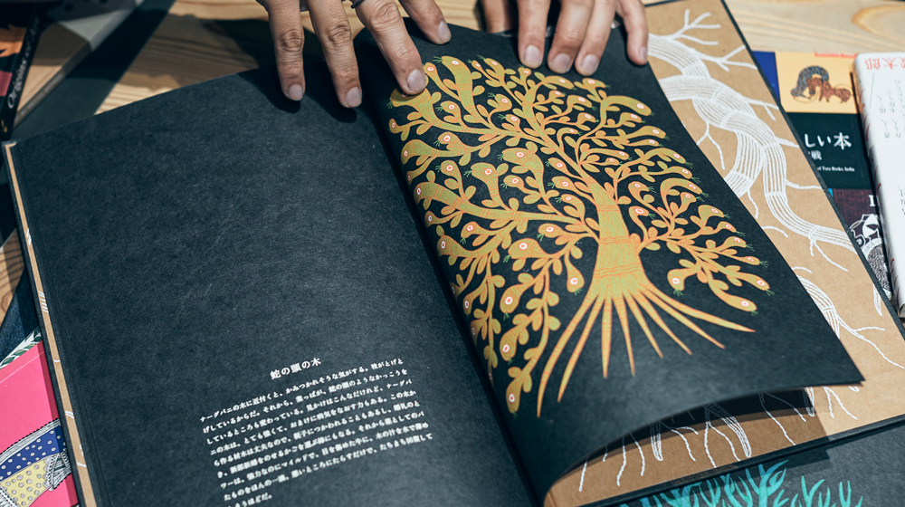 また、〈タラブックス〉のロングセラーである『夜の木』の舞台であるパタンカル村や、先住民族による絵画様式のゴンド画についても、松岡さんが現地で撮影された写真とともにご紹介。〈タラブックス〉の書籍でイラストを手がけるゴンド画作家バジューとの出会いのエピソードや、バジューと松岡さんによる共著『オリジンズ オブ アート』についての制作秘話も伺いました。