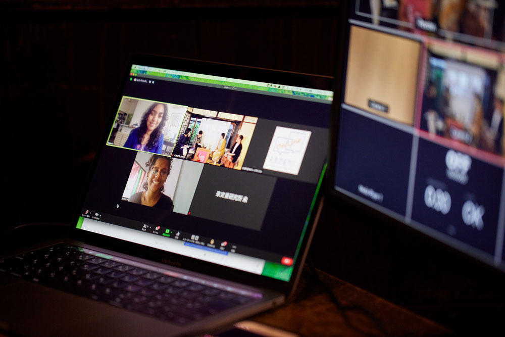 今回のイベントでの大きな試みの1つが、オンラインのコミュニケーションツール「zoom」を使って、インドの〈タラブックス〉とリアルタイムで繋がることでした。インドからご参加いただいたのは、書籍のデザインを担当するラギニさんとロヒニさん。今のインドや〈タラブックス〉の状況をはじめ、制作において大切にされていること、大変だったことなどについてお話しいただきました。参加者からの質問にもお答えいただき、貴重な時間を共有することができました。