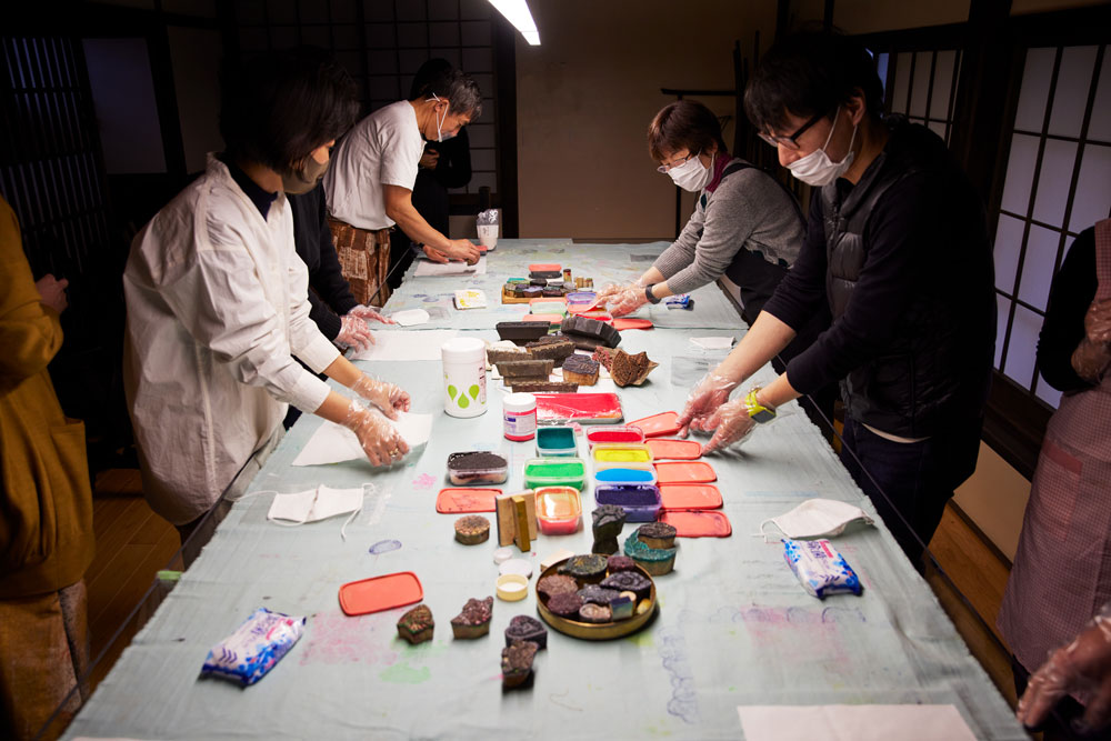 来場者で、〈retela〉のブロックプリントを体験。