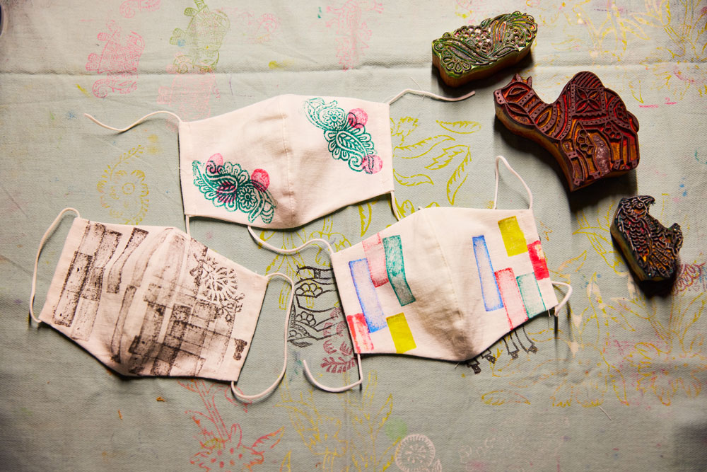 最後は、大越さんによるワークショップ。大越さんお手製のカディコットン*2を使ったマスクに、映像でも観たブロックプリントを施す体験をしました。木版は、インド・ジャンプールから大越さんが持ち帰ったもの。アンティークショップで購入したり、オリジナルで作ってもらったりしたという手彫りの木版は、驚くほど細かく、見ているとほっこりした気持ちになる絵柄で、手仕事ならではのぬくもりを感じます。