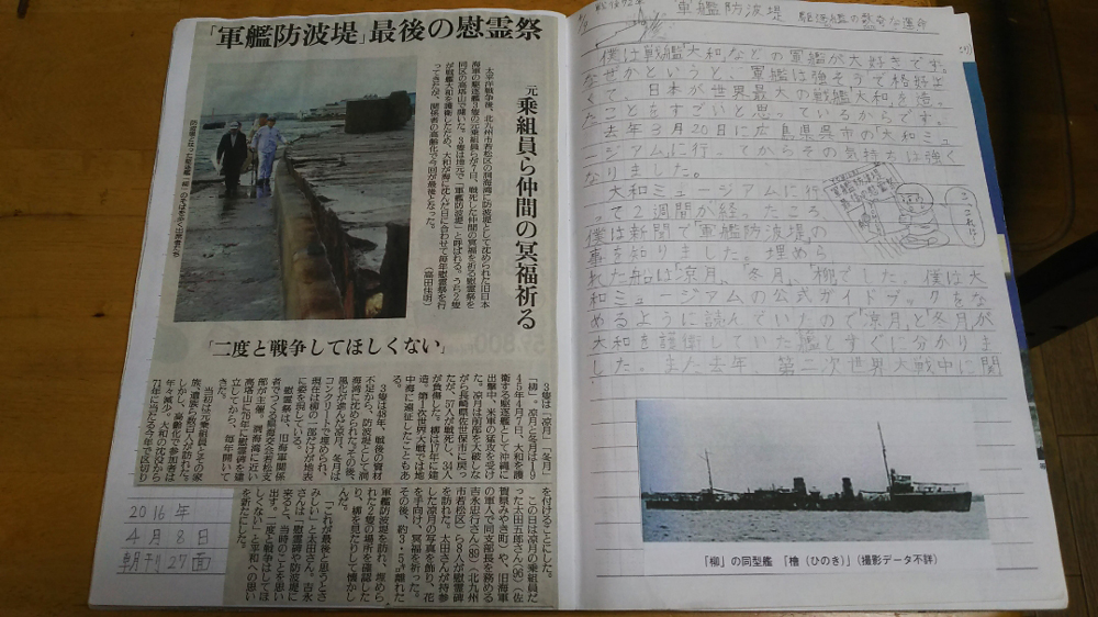 中学2年生になったばかりのころ、北九州市若松区に今では全国でも数えるほどしか残っていない軍艦防波堤があることを読売新聞朝刊で知りました。その記事について記したページが特に印象に残っています。