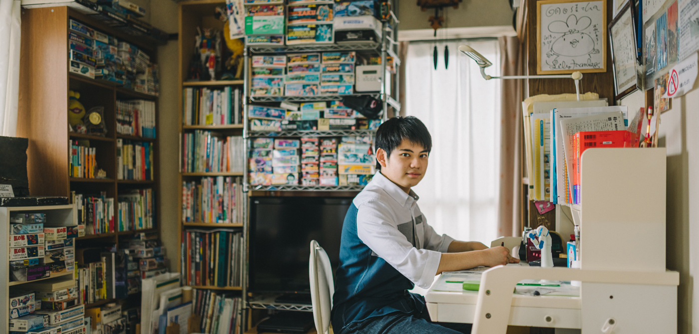 勉強机に向かって自学に取り組む梅田くん。ずっと三菱鉛筆の2Bを愛用しているのだそう