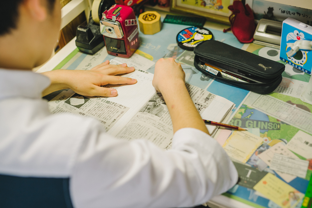「何でも好きなことをやっていい」という小学校の宿題がきっかけです。小学2年生の時は、自分が通っていた幼稚園に取材したことを画用紙にまとめて提出しました。思えばこれが僕の「初取材」です。はじめて新聞記事を取り上げたのは、小学3年生の時。ぼくの地元であるJR小倉駅前に設置された小倉祇園太鼓像のバチが盗まれたという記事(2011年6月)に、「とった人は、ばちがあたるぞ〜!!」という一言を添えました(笑)。その時から今も変わらず、5mmの方眼ノートを使っています。
