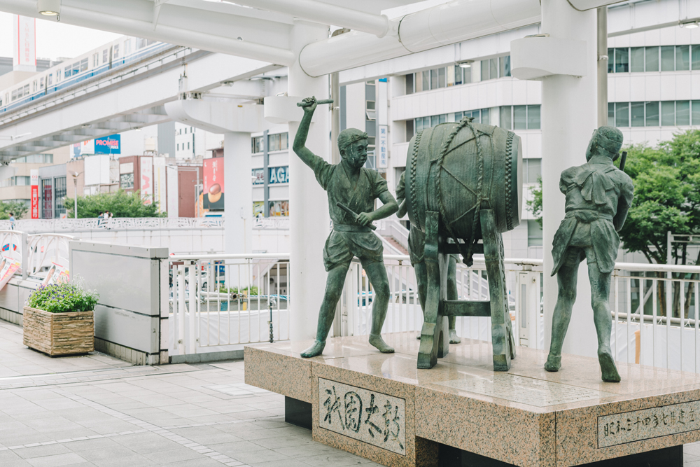 小倉駅南口にある小倉祇園太鼓像。当時、高く振りかざした右手のバチが盗難に遭った