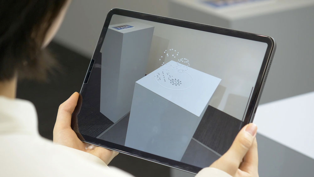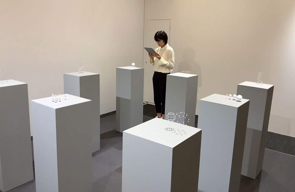 「異なる音が流れる複数の展示台にiPadをかざすと、その音がARアニメーションになった映像が見られるという作品です。今はiPadですが、ゴーグル型の〈ホロレンズ2〉で見ることができたり、音がスピーカーの間を様々な向きやスピードで移動して、それに合わせてアニメーションを動かしたりということも考えています」