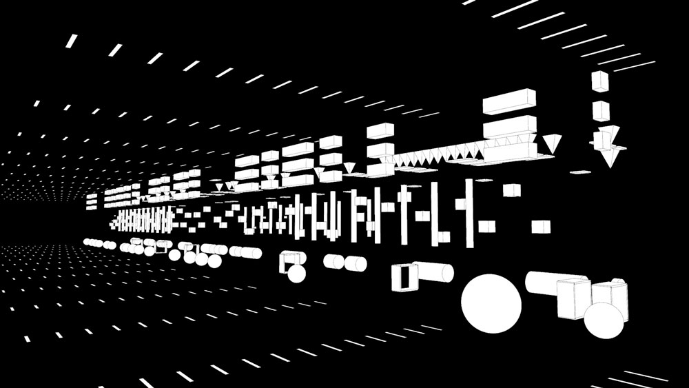 形にして、あとは動きの速さを含めて考えて、丸い形、三角錐などの形の要素に行き着きました。ひとつずつの音を形と動きで表現するので、それだけでも要素が多くなり色は自然と無くなりました」