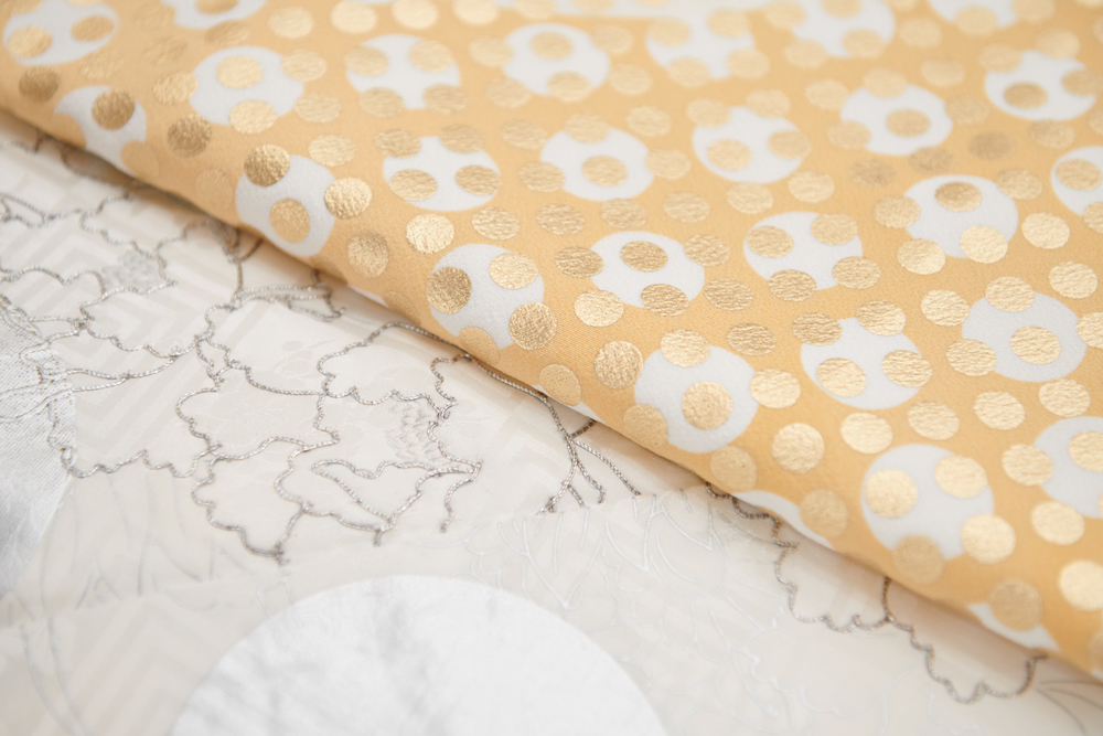 オリンピックに向けて、海外から日本に注目が集まっています。2月29日からロンドンのヴィクトリア&アルバート博物館で大規模な着物展が開催されます。私の着物一式もパーマネントコレクションとして収蔵され、展示されることになりました。また、海外企業とのプロジェクトもいくつか進行しているのですが、彼らが私に注目している理由として、いつもキーワードにあがるのは「サステナブル」と「ジェンダー」です。着物がサステナブルだということ、そして、その着物を扱う私が女性であるということが大きな理由のようです。着物の素材となる絹は、手入れをすれば100年もつ繊維だと言われています。絹を生み出す蚕は、一反の着物に約2,700頭が必要で、蚕のえさとなる桑の葉は約98kgを必要とします。2,700頭の繭から糸を作り、織り、染める。今、日本中のタンスにも、問屋さんにも、多くの着物が眠っています。以前、「リノベーション」をテーマにした作品を発表しました。母や親戚から譲り受けた着物を一旦ほどいた後、脱色して箔を乗せたり、上から型染めをする施したりなどして、新たな着物として生まれ変わらせたものです。かつての日本では、染め替えや仕立て直しをして、代々着続けることは当り前に行われていましたが、一から作るよりも手間も費用もかかることもあり、現代では非常に特別なことになっています。この作品は、かつては当り前だったことを新鮮に感じるという時代の流れと、その事実に向き合う際の思考の刷新、同時に物を大切にするということを再考するためのアプローチでもあります。