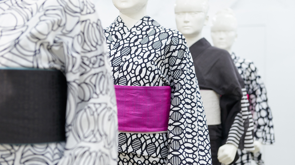 円と直線で構成されるデザインに、着物の新しい自由さと世界へと羽ばたく可能性を感じます。