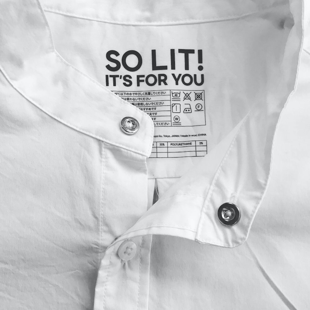 最近のお気に入りは、「オール・インクルーシブファッション」を掲げるSOLITのブロードシャツ。「IT’S FOR YOU」のタグが目を引く。