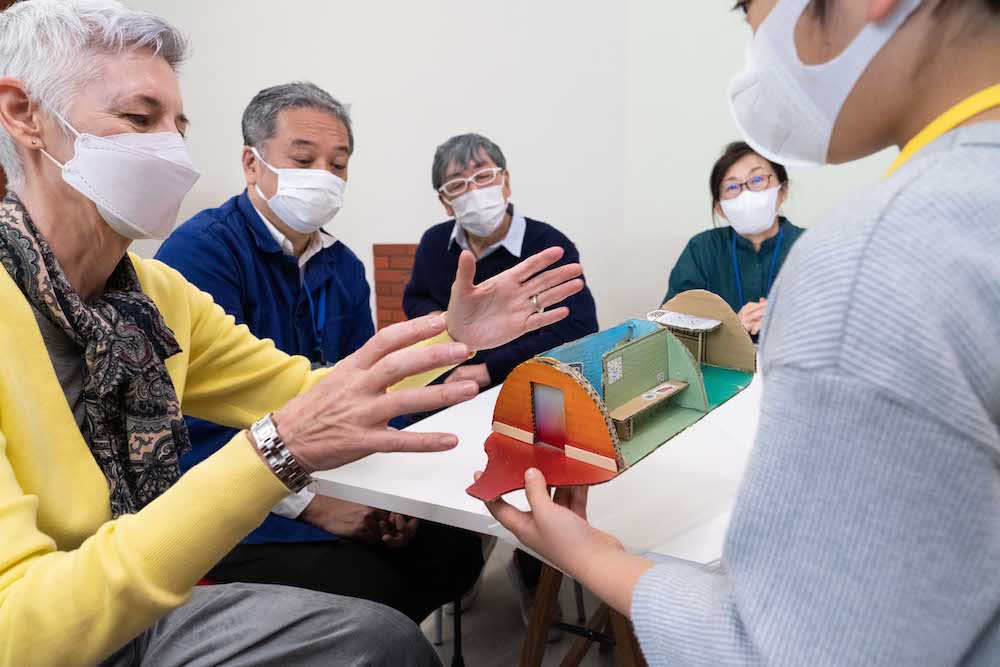 左から、講師のアストリッド・クラインさん、太田浩史さん、伊東豊雄さん、柴田淑子さん。子どもたちのアイデアを講評するときは、大人たちも真剣そのもの。よかったところは褒めながら、改善できるところはとことん話し合っていきます。