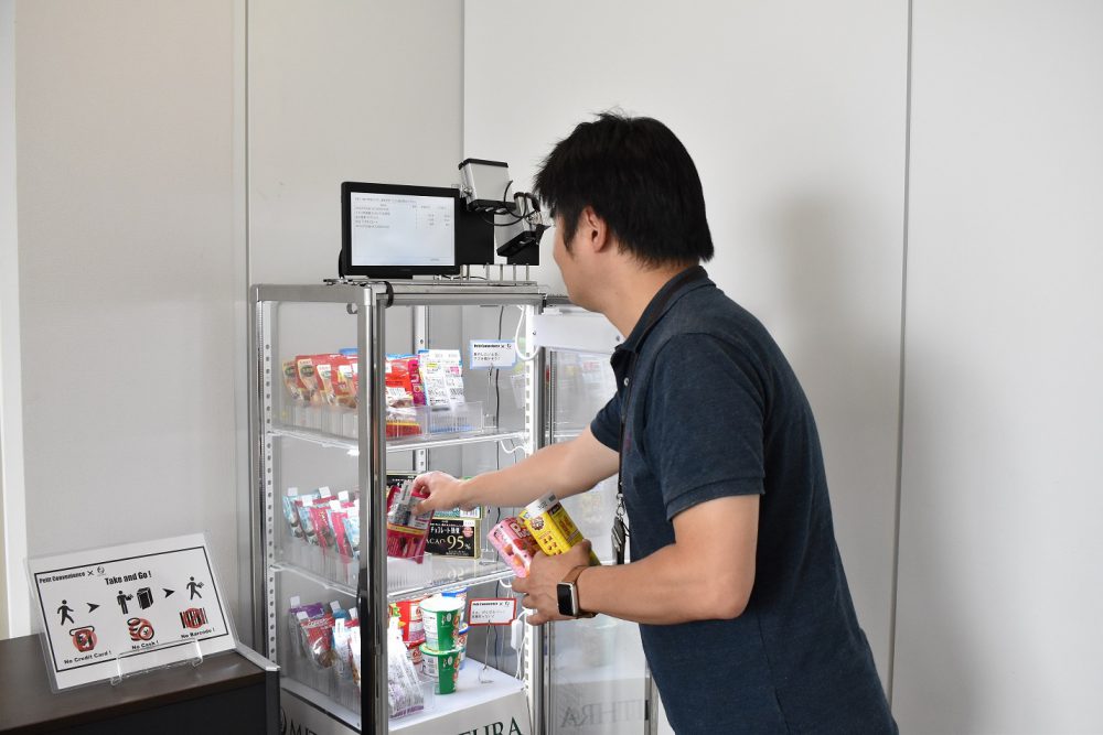 さらに、このライフスタイル認証を活用すれば、ユーザーは何もせずに買い物ができるようになると山口さん。2019年には、三菱UFJニコスと三菱電機インフォメーションシステムズ(MDIS)とともに、無人店舗での決済を想定した実証実験(写真参照)を行いました。スマホを携帯した利用者が冷蔵庫型の自販機の前に立つと、ドアが自動で開くようになっており、商品を取りドアを閉めると、事前に登録済みのクレジットカードにて決済が完了。このサービスは、近い将来の実用化を目指して研究開発が進められています。